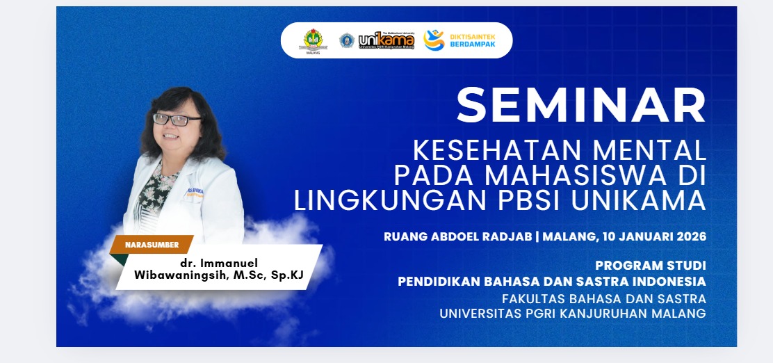 Program Studi Pendidikan Bahasa dan Sastra Indonesia (PBSI) Universitas PGRI Kanjuruhan Malang menyelenggarakan Seminar Kesehatan Mental pada Mahasiswa di Lingkungan PBSI Unikama pada Jumat, 10 Januari 2026, bertempat di Ruang Abdoel Radjab, Malang. Kegiatan ini diinisiasi sebagai bentuk kepedulian akademik terhadap kesehatan mental mahasiswa di lingkungan kampus.